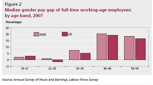 The graph below from the Economic & Labour Market Review Vol 2 / No 4 / April 2008 shows that there is no discernible pay gap between men and women working full-time (median) until a women reaches her mid 30's (7% gap) and then accelerates to around 19% when a woman is in her mid forties.